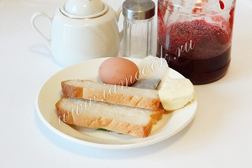 1. Для приготовления понадобятся яйца, хлеб (тостовый или кирпичиком), пакетик чая, сахар, ягодный джем, сливочное масло, соль и перец по вкусу.