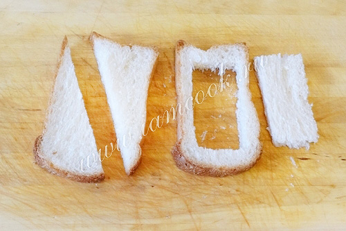 4. Нарезать хлеб следующим образом: для тостов треугольничками, для яичницы: вырезать из хлеба мякишь, чтобы рамочка осталась целой.