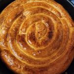 Слоеный пирог «Улитка» с фаршем готов. Извлечем его из духовки и дадим слегка остыть, затем переместим на блюдо.