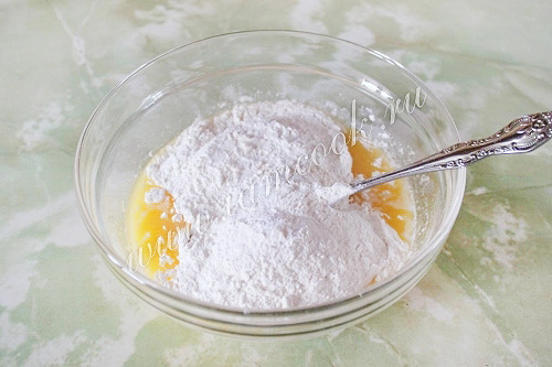 Затем добавьте муку с содой. Соду гасить не нужно, она среагирует с кислотой сметаны. Сахар - по желанию, но немного.