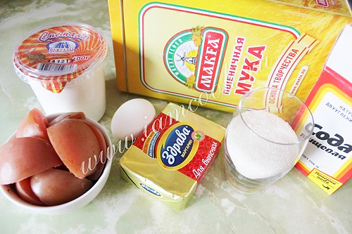 Подготовьте сметану, муку, сахар и ванильный сахар, яблоки из компота сливочное масло или маргарин для выпечки, куриное яйцо и соду: