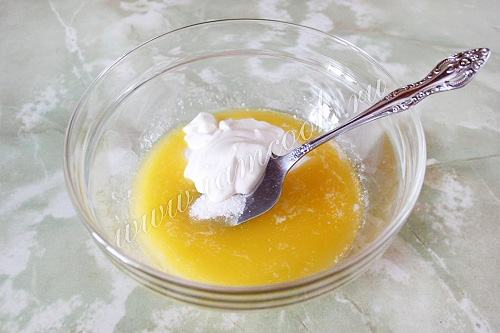 Для теста растопите сливочное масло и в теплое добавьте сметану. Перемешайте.