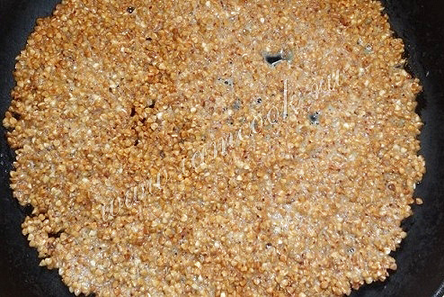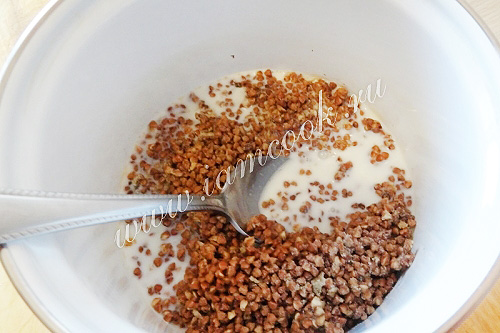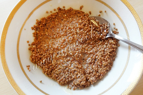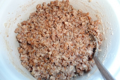 3. Добавить крупу. Хорошо перетереть гречку с яйцом.