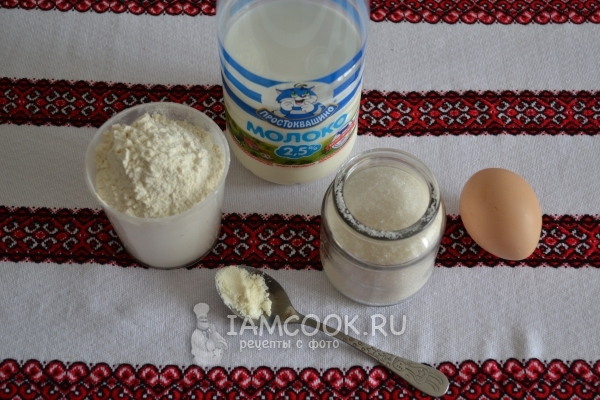В сотейник вбить куриное яйцо, всыпать сахар и ванильный сахар. Взбить миксером в однородную массу. Сахар должен полностью растаять. Влить молоко и снова перемешать. Затем всыпать просеянную муку.