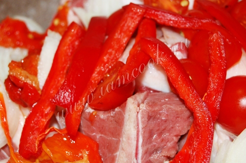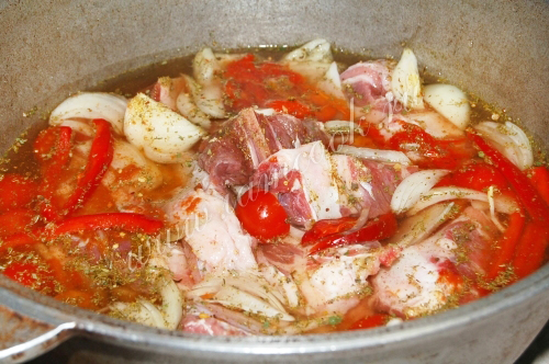 Когда все овощи и мясо уложены в казан, налить в него воду, чтобы овощи были только покрыты водой. Добавить соль, перец, специи.
