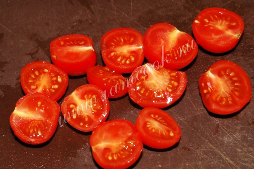 Помидоры нарезать дольками.Если используются помидоры черри, то достаточно разрезать их на половинки.