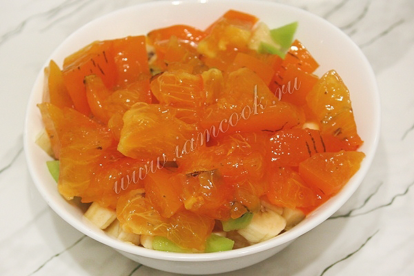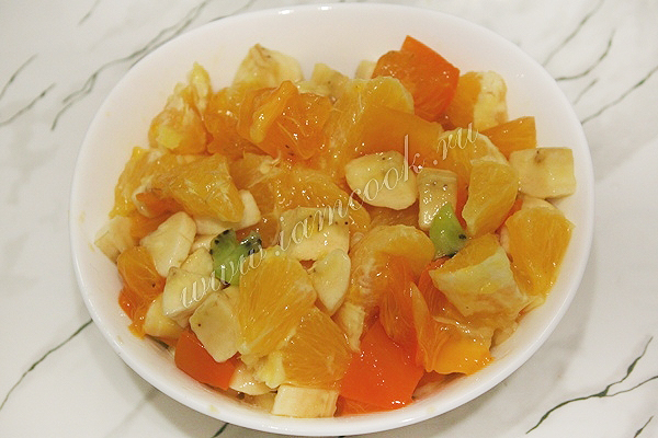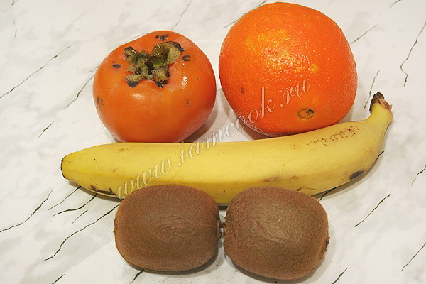 Фруктовые салаты особенно полезно есть зимой, поскольку они пополняют запас необходимых в зимний период витаминов. Этот салат не требует заправки. Сок сочной хурмы смешивается с соком спелого сладкого апельсина, поэтому салат не требуется дополнительно чем-то заправлять. Но по желанию можете добавить йогурт или мед смешанный с лимонным соком.