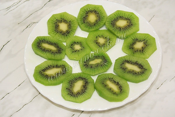 Киви очистите и нарежьте кружочками. Выложите на тарелку.