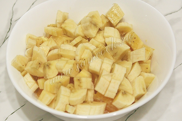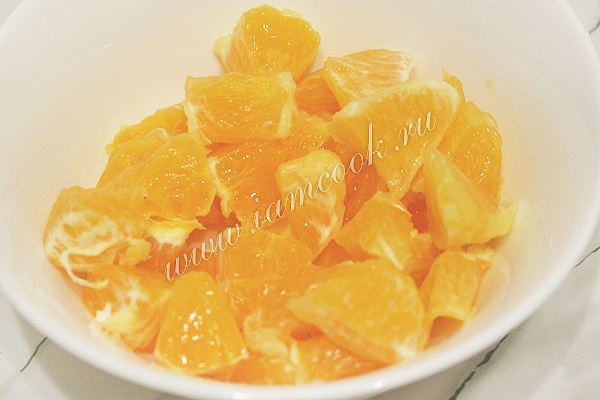 Апельсин очистите, разделите на дольки и нарежьте каждую дольку на 3-4 части.