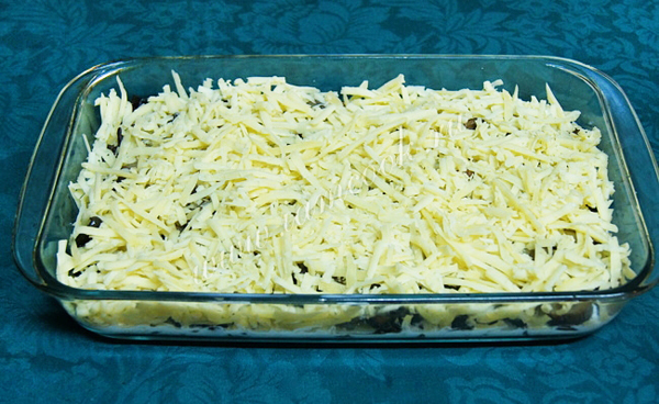 Поверх всего этого выложить 250-300 грамм тертого сыра. Убрать форму в духовой шкаф разогреты до 200 градусов и запекать до румяной корочки, у меня ушло около 15 минут.