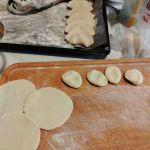 Каждую лепешечку раскатать парой движений скалкой в тоненький кружочек. Я делаю самый тонкий. В центр выложить начинку и слепить вареник. Очень легко работать с этой начинкой, она пластична и послушна, ничего не вытекает, можно регулировать степень наполненности вареника. Тщательно скрепить края, чтобы при варке вареник не расклеился. Я почти не использовала муку для подпыла, она мне была не нужна.