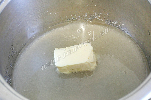 В кастрюлю с толстым дном высыпьте сахар, долейте воду и бросьте сливочное масло.