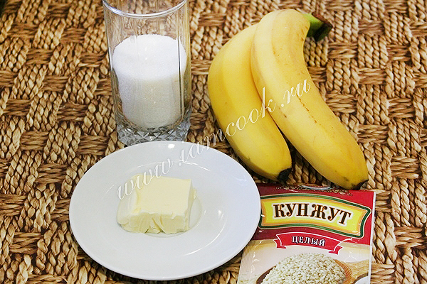 Подготовьте базовые ингредиенты для десерта: сахар, бананы, сливочное масло и кунжут.
