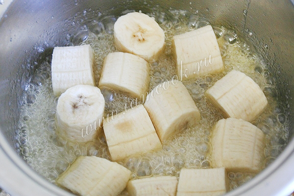 Выложите в кастрюлю кусочки бананов.
