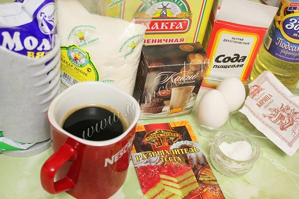 Подготовьте муку, заваренный кофе, сахар, соль, корицу, яйца, разрыхлитель, соду, растительное масло, молоко и какао-порошок: