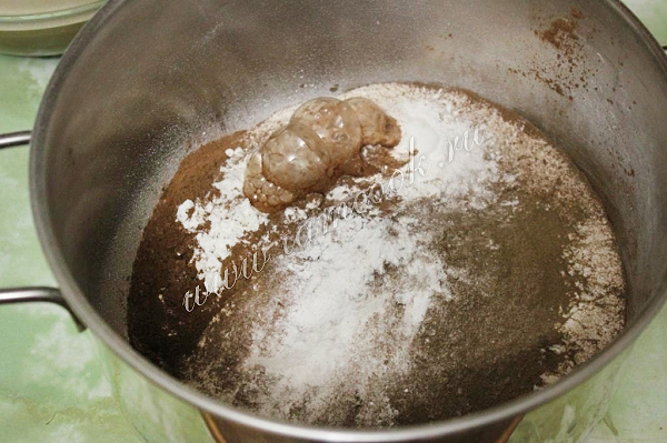 Отдельно соедините и перемешайте муку, какао, разрыхлитель, корицу и соду гашеную.