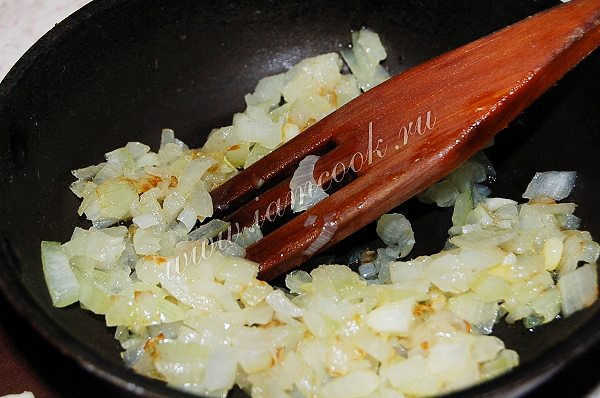 Все продукты подготовлены, теперь можно приступить непосредственно к готовке жульена. На сковороде растопить сливочное масло, выложить нарезанный репчатый лук и обжаривать до прозрачности лука.