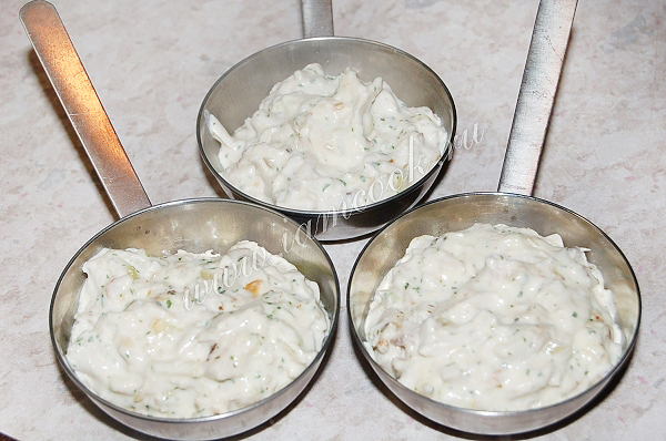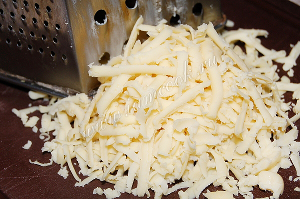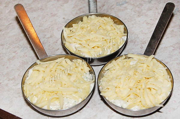 Сверху каждой кокотницы присыпать толстым слоем сыра.