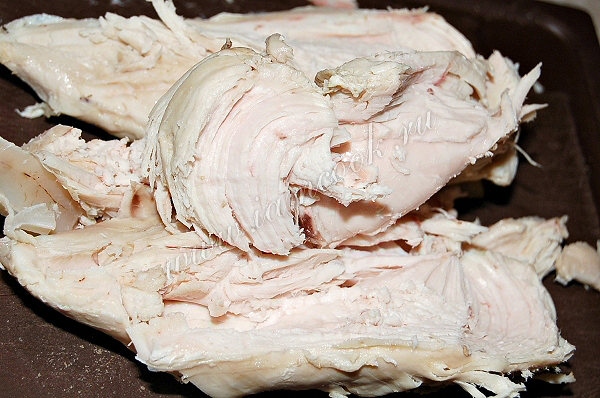 Для куриного жульена, мясо птицы необходимо отварить, остудить, отделить мясо от костей.