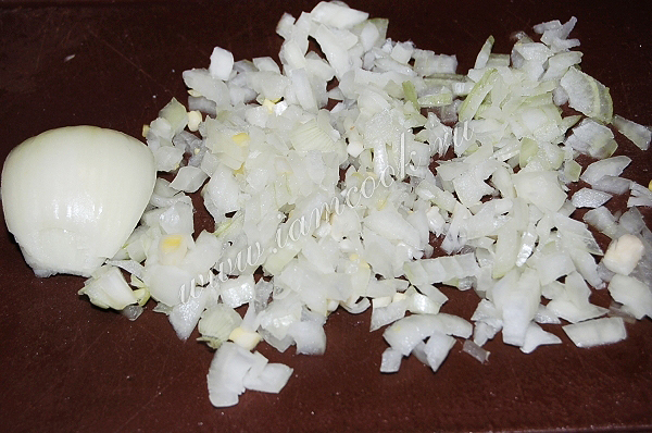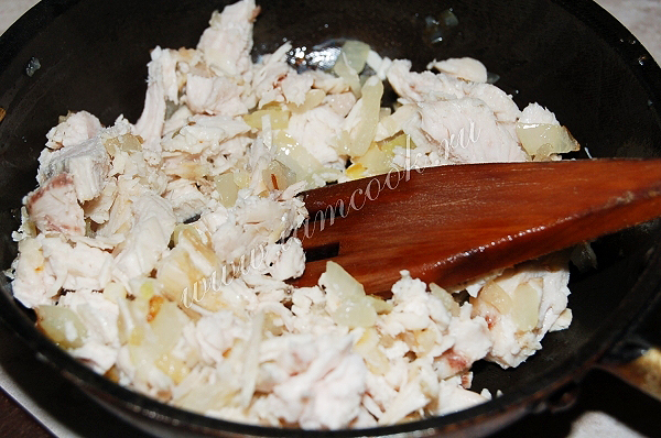 Когда лук будет почти готов, добавить к нему мелко нарезанную курицу.