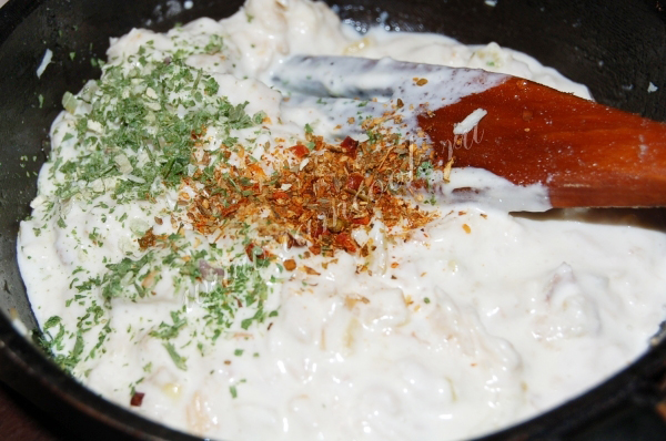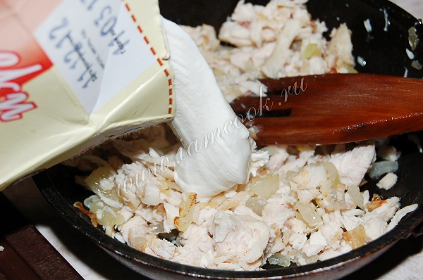 Через 5 минут после добавления курицы, влить сливки в сковородку.