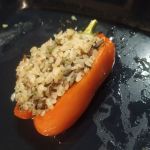 Накрыть перцы фольгой (чтобы рис не подсыхал во время запекания), можно, кстати, накрыть рис кружочком свежего помидора. Поставить запекаться при 170 градусах в режиме верхнего и нижнего нагрева на 30-40 минут. Если хотите, чтобы рис был более разваренным, налейте в каждый перец немного овощного бульона. При желании можно смешать любимый томатный соус с водой и им полить перцы.