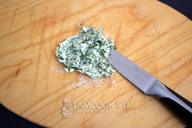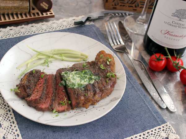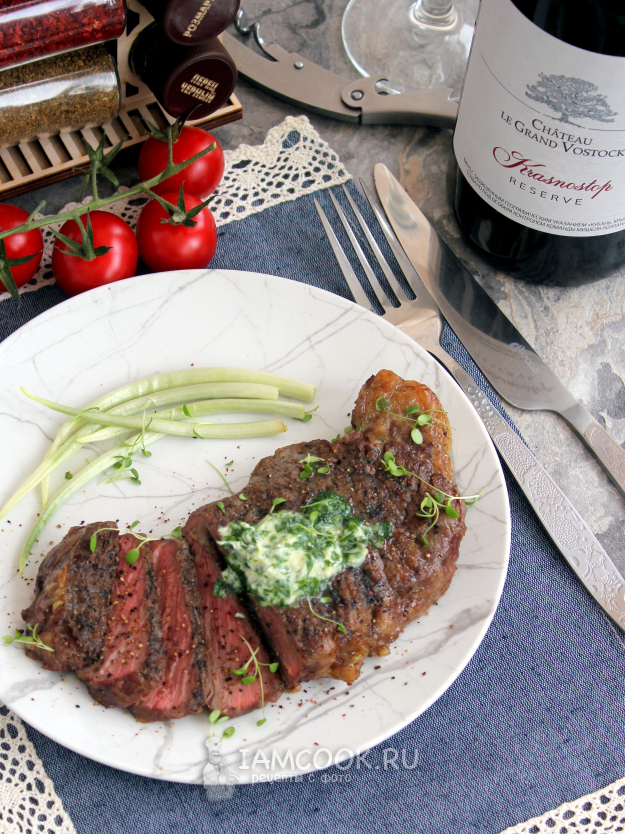 Очень в тему для подачи стейков из говядины чесночное масло. Для него просто размягченное сливочное масло перетирают с мелко рубленной зеленью и измельченным чесноком в количестве на свой вкус и солят тоже по вкусу. Держат эту заготовку в холодильнике.