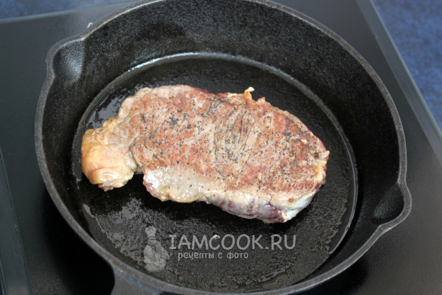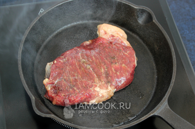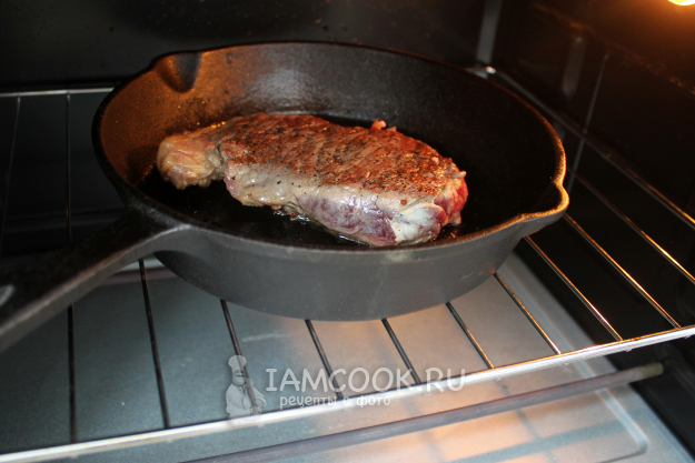 Если сковородка чугунная, то прямо на ней отправьте кусок мяса в разогретую духовку.