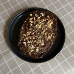 Прямоугольную форму застелить пергаментом, выложить тесто. Сверху посыпать смесью коричневого сахара с орехами.
