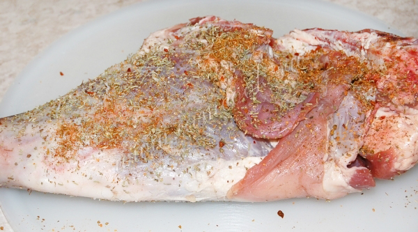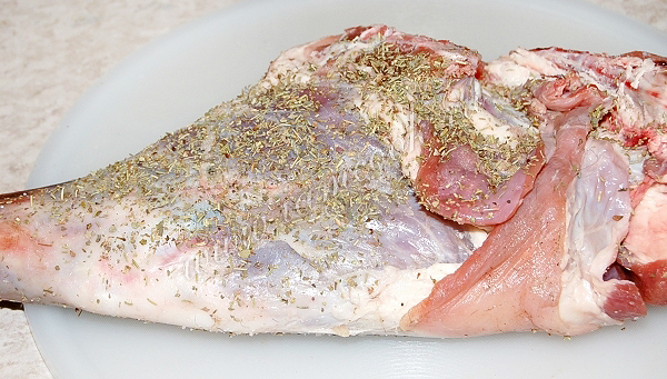 Посолить и поперчить изнутри и снаружи. Посыпать сухими травами. Лучше всего для баранины подходят французские и итальянские наборы трав.