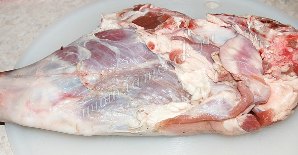 Аккуратно разрезать рукав и вытащить баранью ногу из него. Разместить на блюде.