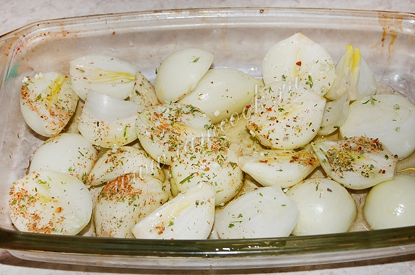 В качестве гарнира отлично подойдет запеченный репчатый лук. Для этого луковки почистить, уложить в форму, посыпать солью и любимыми специями, полить оливковым маслом и запекать в духовке 30 минут, при температуре 180 гр.