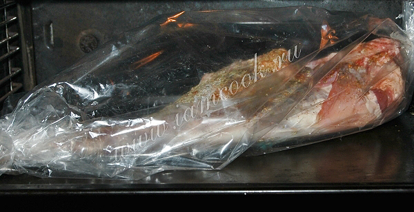 Отправить рукав с бараньей ногой в заранее нагретую до 220 гр.духовку. Через 30 минут уменьшить температуру духовки до 190 гр.