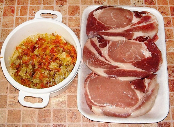 Морковь натереть на терке. Шампиньоны и лук мелко порезать. Рис отварить до готовности. Обжарить лук на сковороде в небольшом количестве растительного масла, затем добавить морковь и грибы, готовить на не большом огне еще 5-7 минут, периодически помешивая. Соединить обжарку с рисом. Помимо начинки приготовить свиную вырезку.