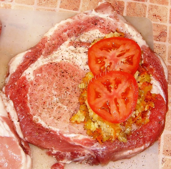 Поверх начинки выложить томат, тонко нарезанный кружком. Укрыть начинку второй половиной мяса.