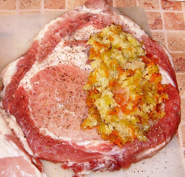 Выложить начинку, приготовленную на первом шаге, на одну половину мяса.