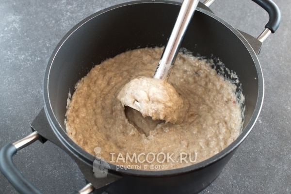 Пробиваем содержимое кастрюли блендером и регулируем густоту супа по желанию, добавляя бульон, который мы слили предварительно.