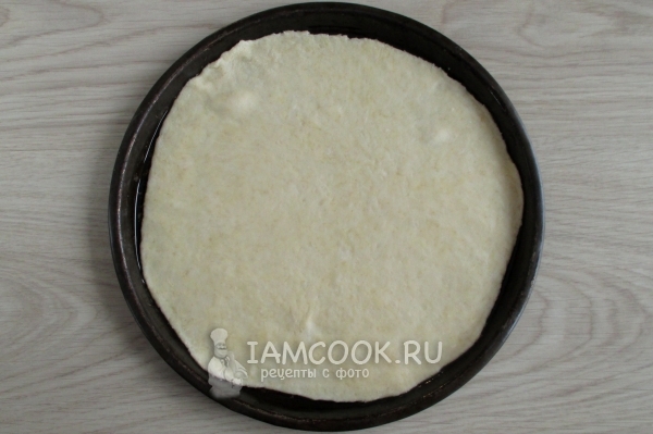 Смажьте оливковым маслом противень или форму. Тесто раскатайте в тонкую лепешку.