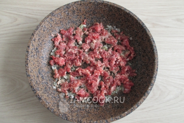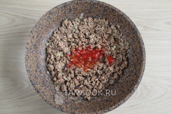 Затем добавьте специи и томатный соус. Перемешайте и потушите до готовности фарша.