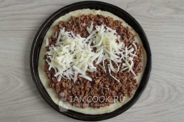 Уложите на тесто начинку из мясного фарша с томатным соусом и посыпьте тертым сыром.