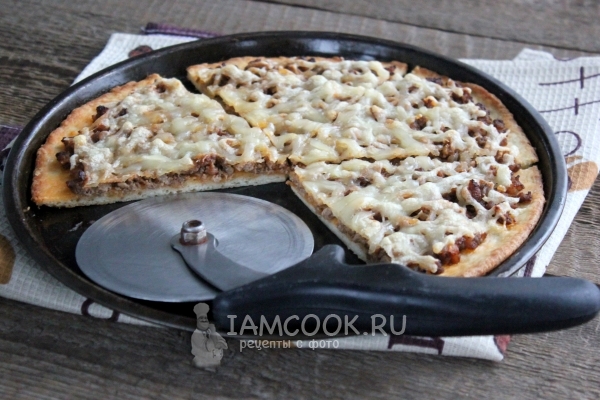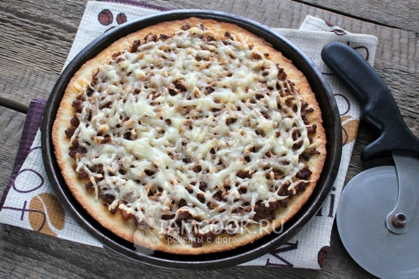 Предлагаю рецепт очень вкусного варианта пиццы - пиццу с мясным фаршем. Особенно подходит домашний фарш из свинины и говядины. Его нужно приготовить по типу соуса болоньезе, т.е., потушить фарш с луком, специями, томатным соусом и красным вином (по желанию).