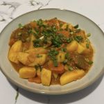 Подаём приготовленную в кастрюле тушёную картошку с говядиной со свежими овощами.