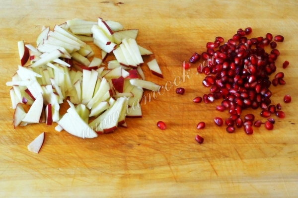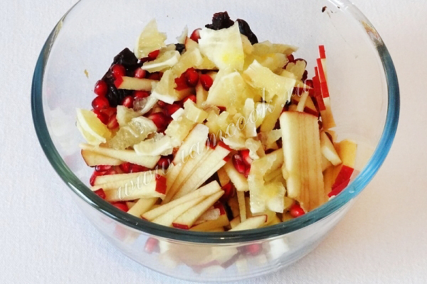 8. Смешать в салатнике яблоко, гранат, лимон, лимонную цедру, курагу и чернослив.