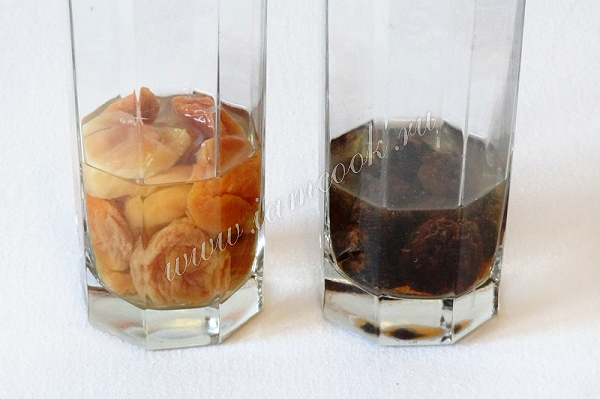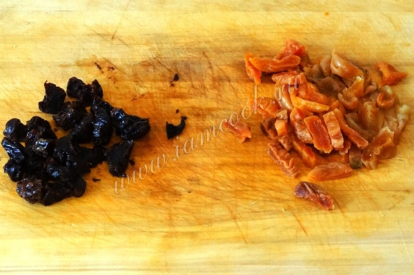 4. Чернослив и курагу залить кипятком и дать настояться 15 минут, сухофрукты распарятся и увеличатся в объеме.