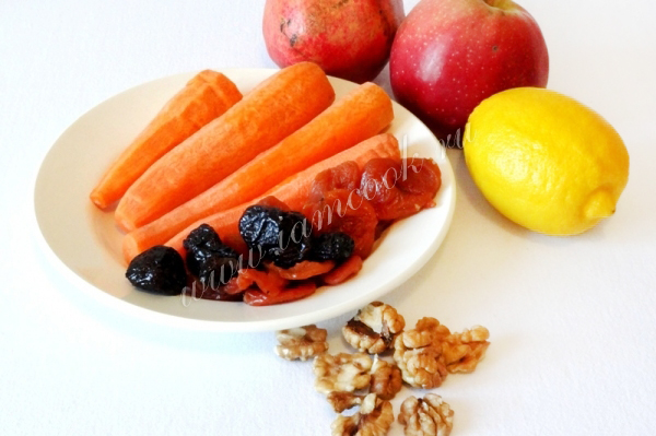 1. Для приготовления понадобятся морковь, сливочное масло (можно заменить жирной домашней сметаной), яблоко, гранат, курага, чернослив, лимон, грецкие орехи.