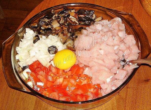 Мелко нарезать томаты и филе индейки. Выложить их в блюдо, добавить обжаренные с баклажанами грибы и 1 яйцо. Посолить и поперчить по вкусу. Перемешать все ингредиенты.