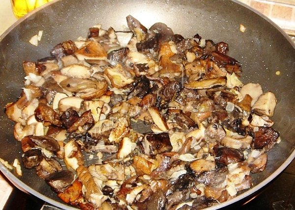 Грибы вымыть, почистить и нарезать небольшими кусочками, затем отварить в подсоленной воде около 15-20 минут. У баклажан срезать попки и измельчить. Нашинковать репчатый лук. На сковороде с растительным маслом обжарить лук, затем добавить грибы и баклажаны, продолжить обжаривать еще 15 минут, периодически помешивая.