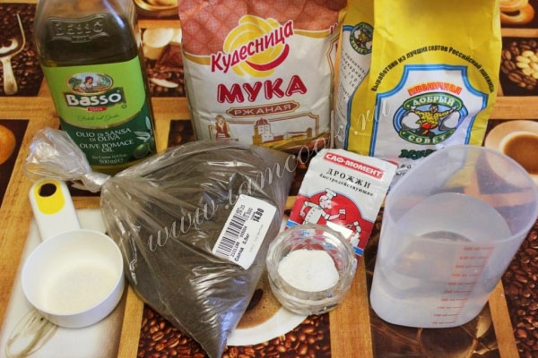 Подготовьте: воду, оливковое масло, муку ржаную и пшеничную, сахар, соль и дрожжи: