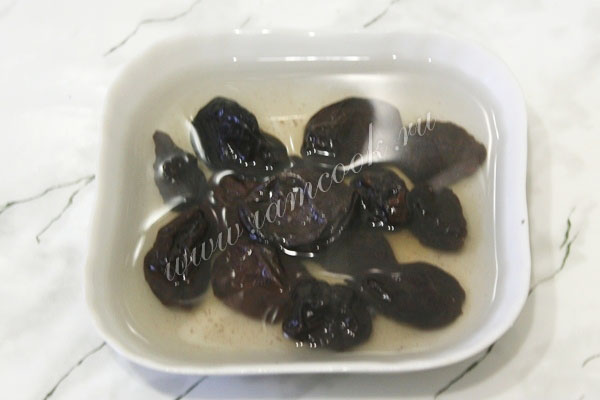 Чернослив запарьте кипятком на 10-15 минут.