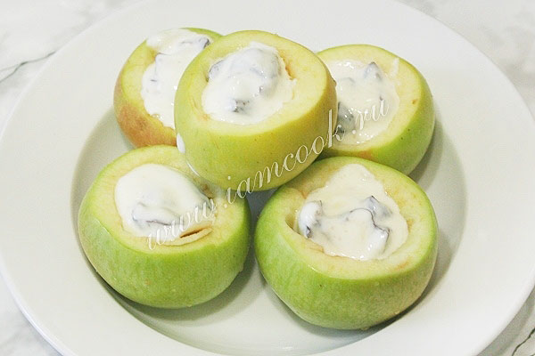 Вылейте начинку в яблоки.
